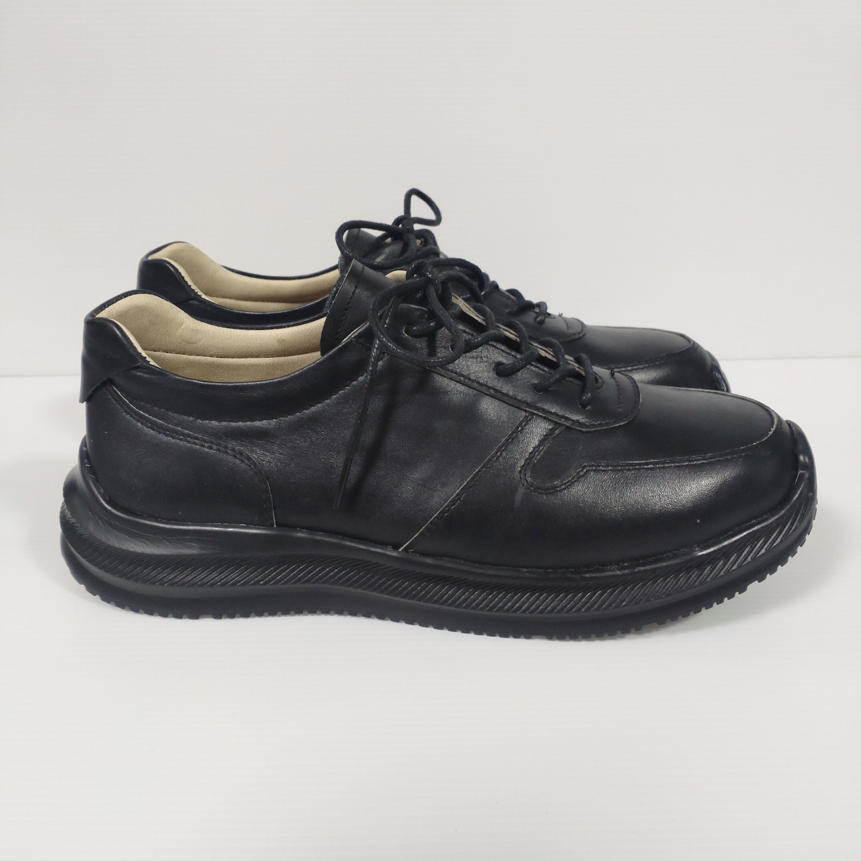 落ち着いたクールな色合いのブラックレザーを使用しビジネスでもカジュアルでも履ける一足です。ソールは軽量ラバーを使用し音も静かで滑りにくくなっております。また柔らかいインソールを採用しているため足に負担をかけない作りです。