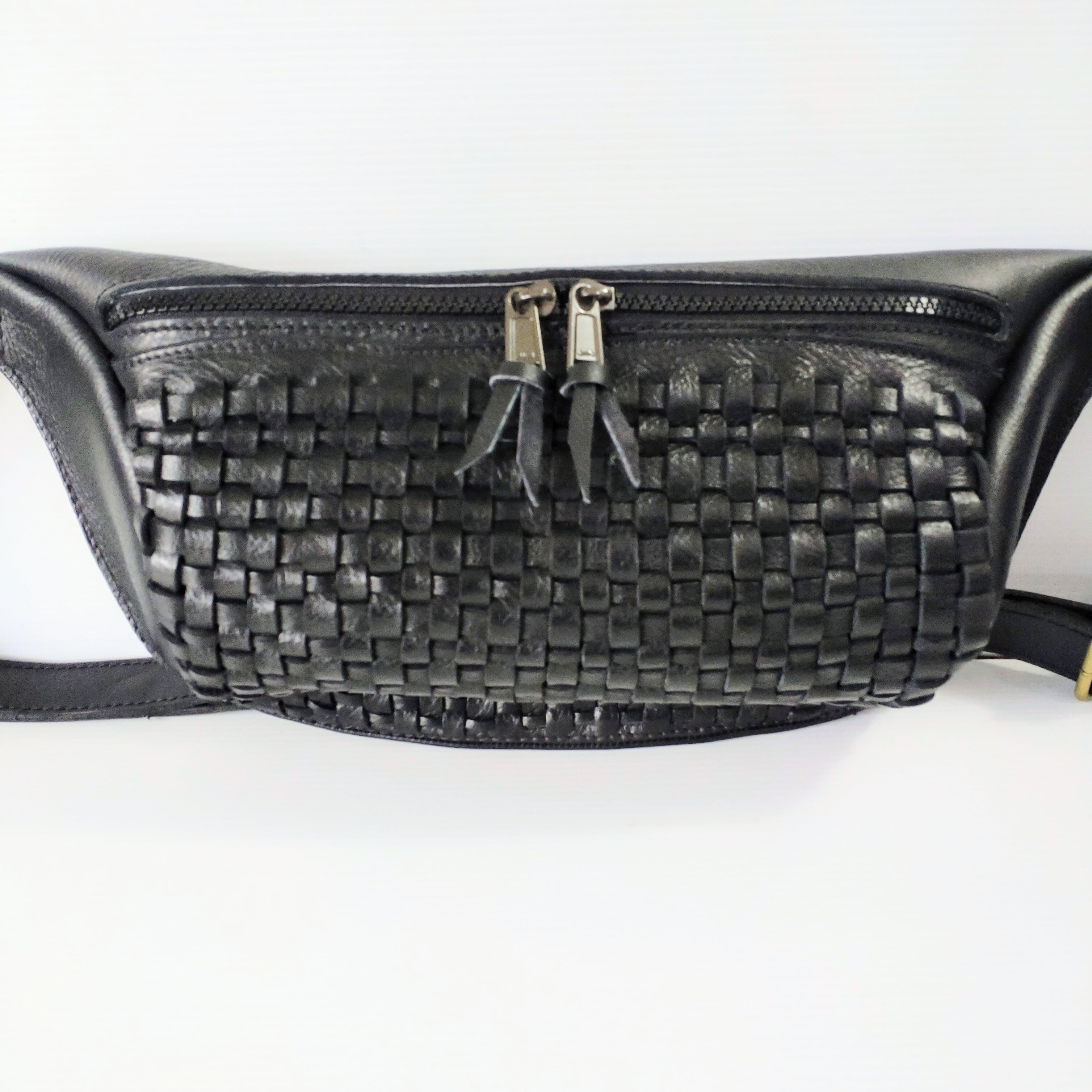 本革レザー仕様の立体型新モデルのボディバッグを製作いたしまた。前面にレザーを手作業で編み込んだおしゃれで高級感あるボディバッグです。