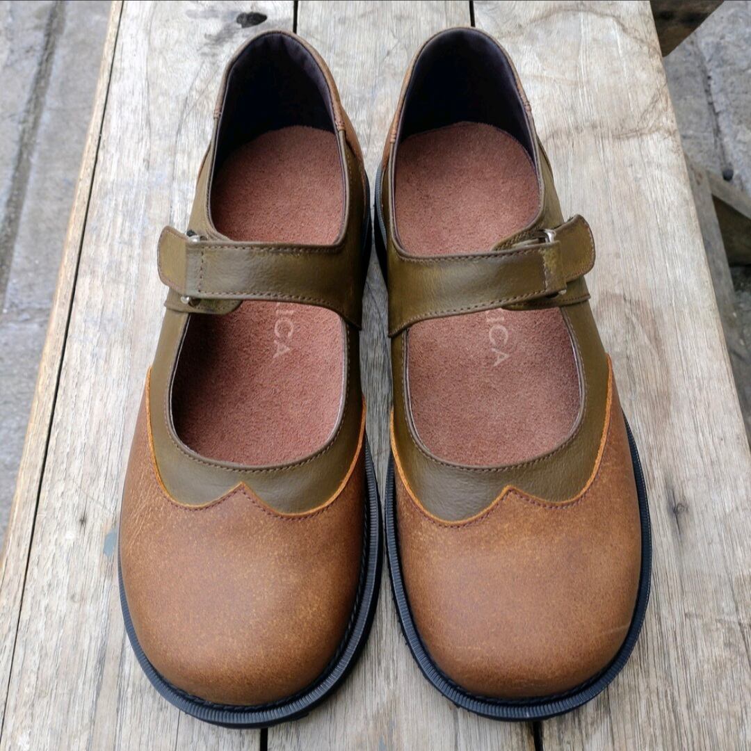 Mexica オリジナル 無駄を省いたやさしい印象の丸型のベルクロサンダル。◆カフェブラウンとグリーン系ブラウンカラー◆無料色変更承ります。革の在庫状況にもよりますので、お気に入りの色がありましたらお問い合わせください。
