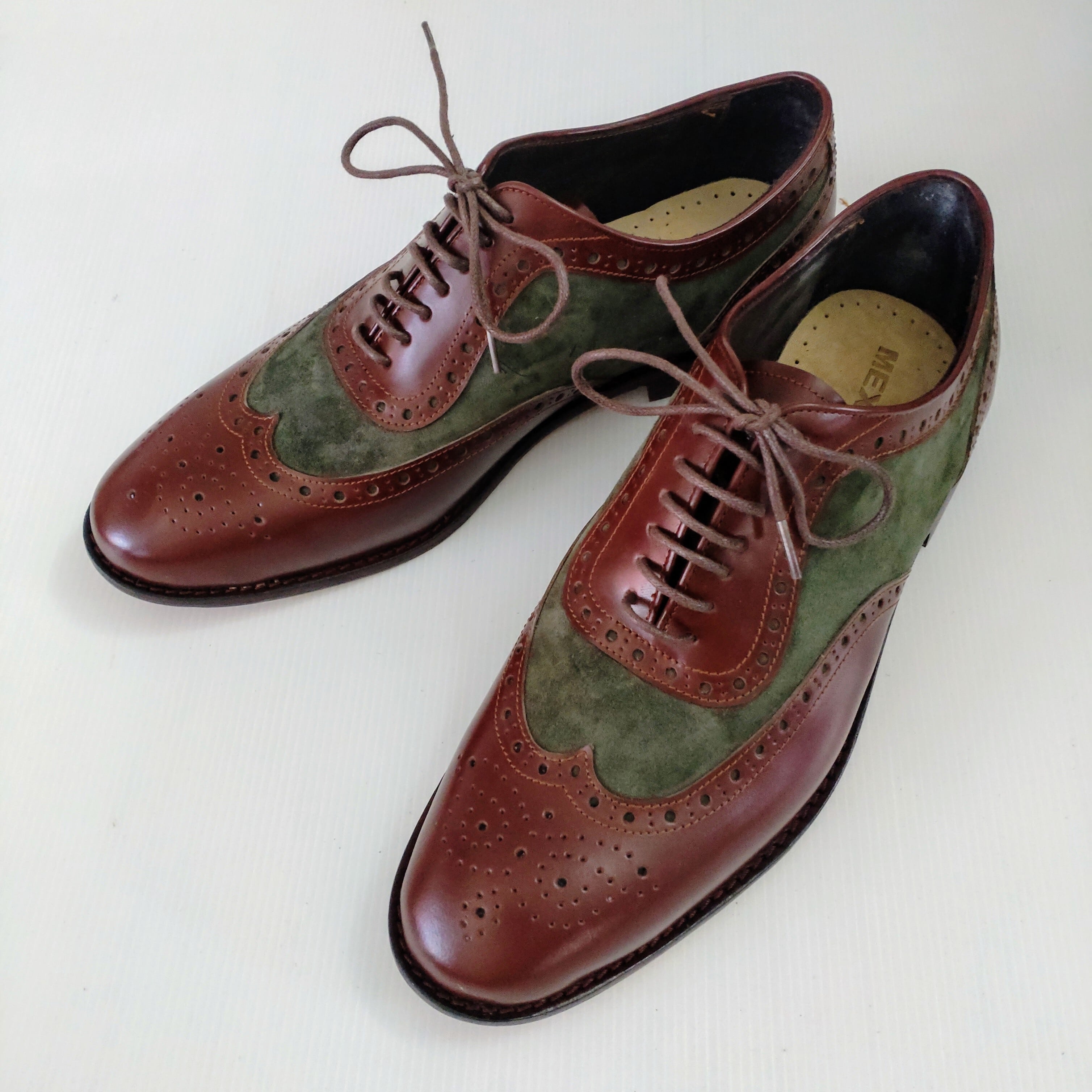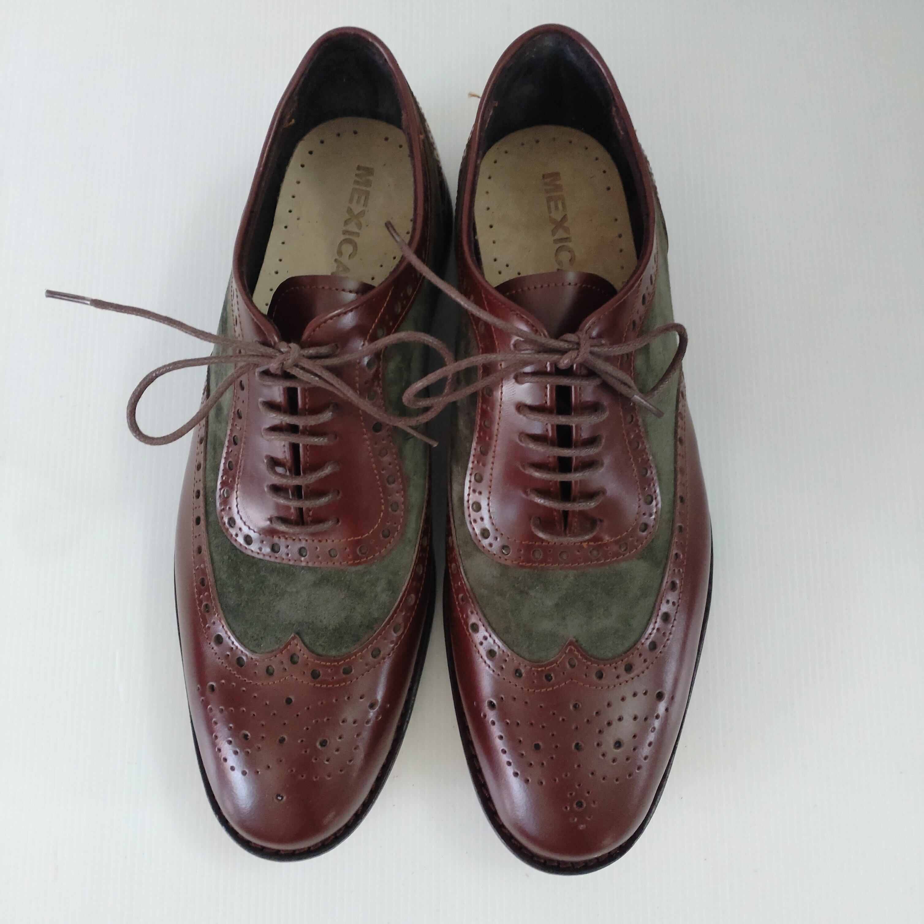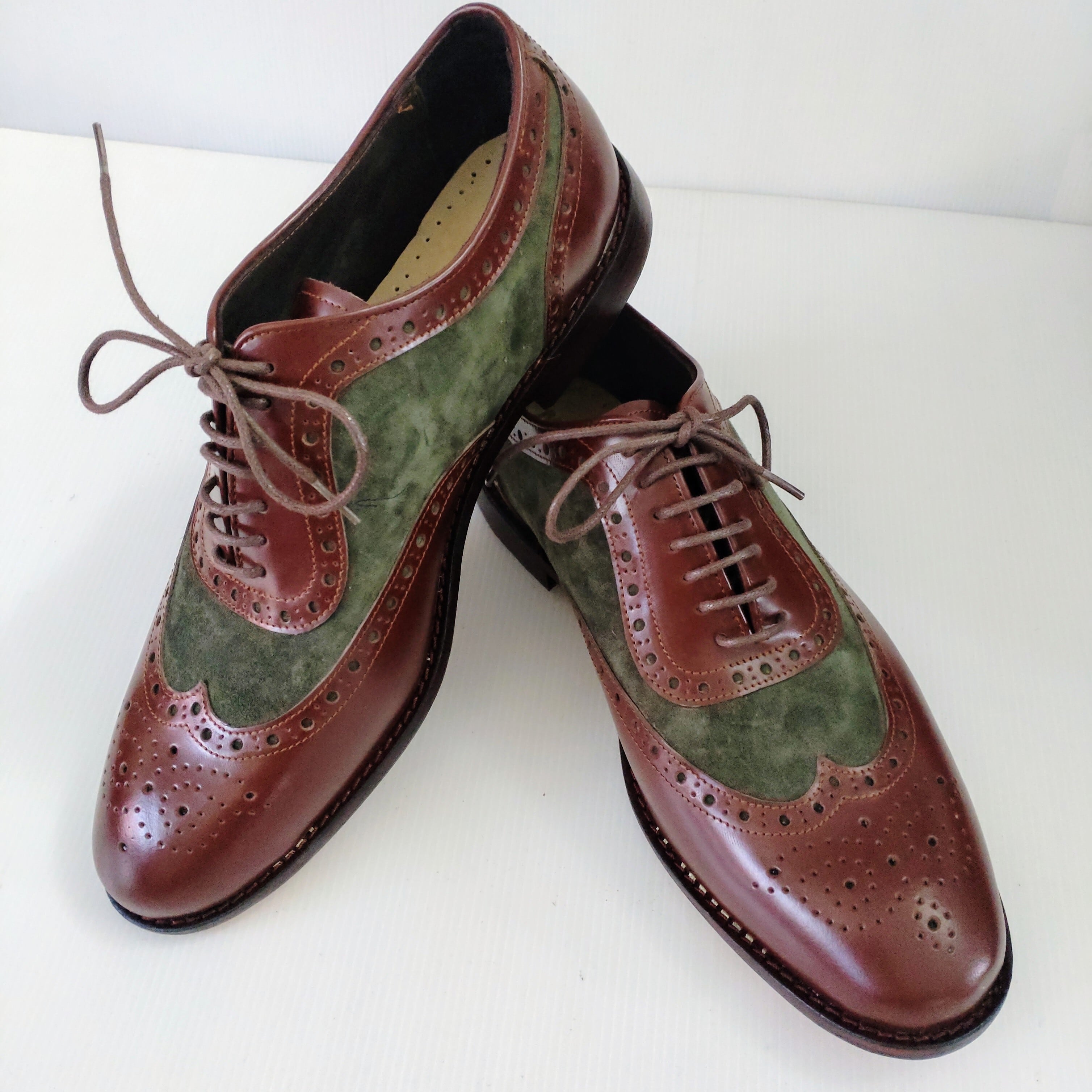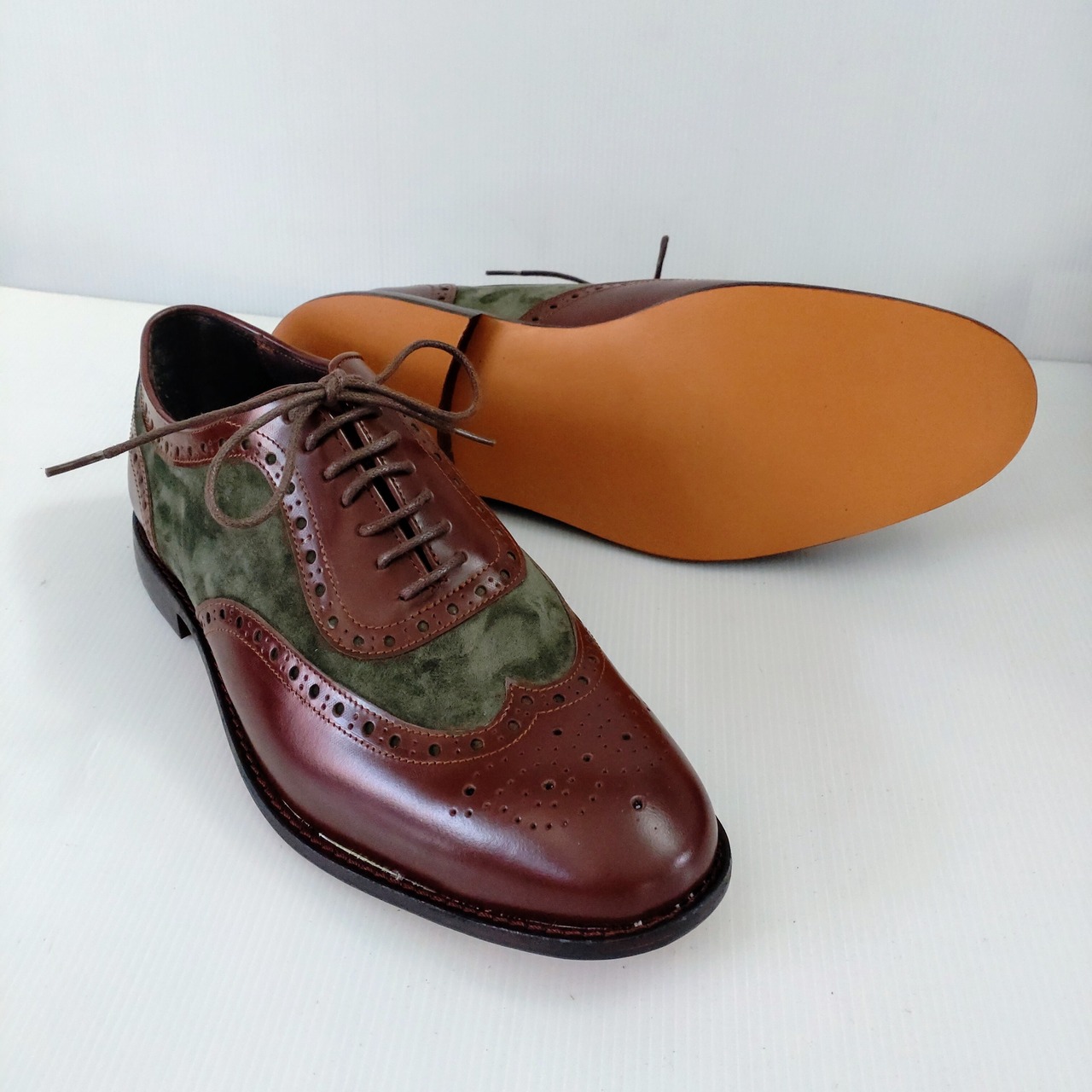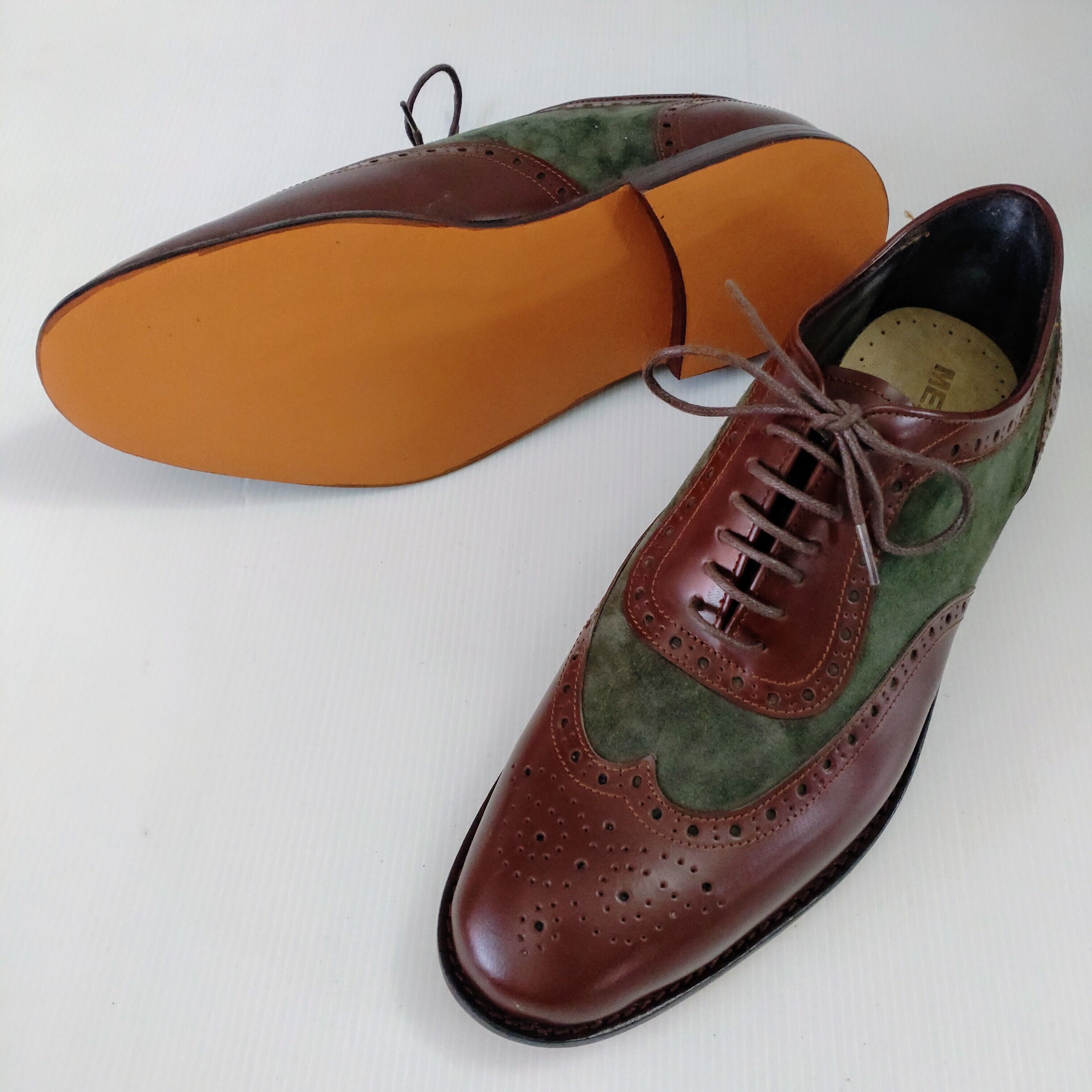 本革ブラウンレザーとスエードグリーンでメダリオン装飾したオシャレな本革ウイングチップシューズを製作致しました。