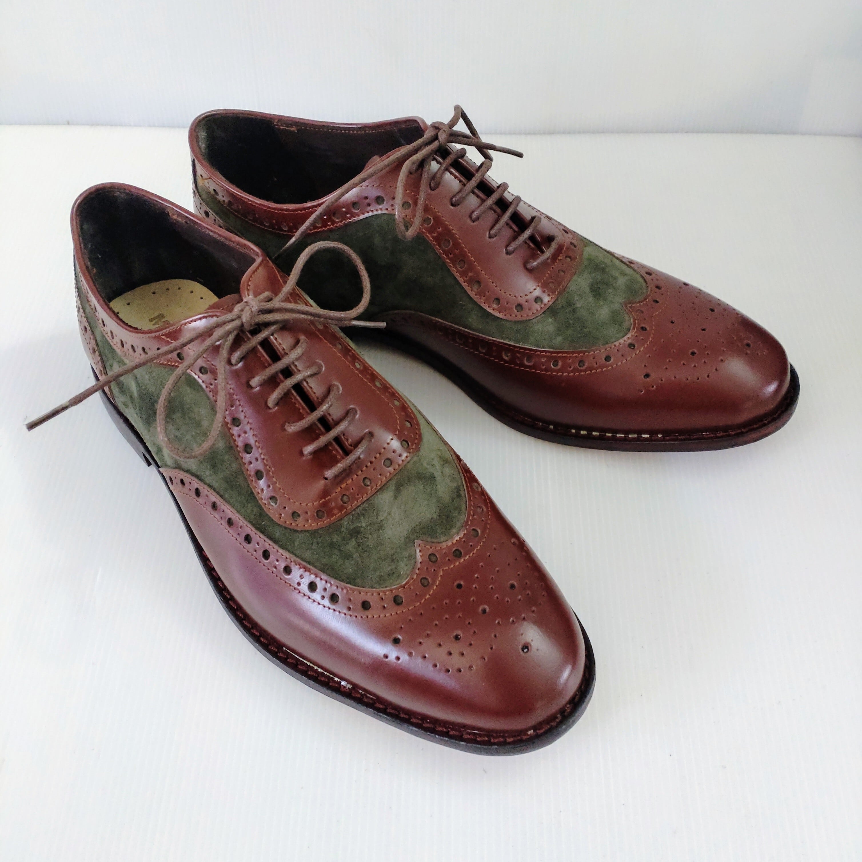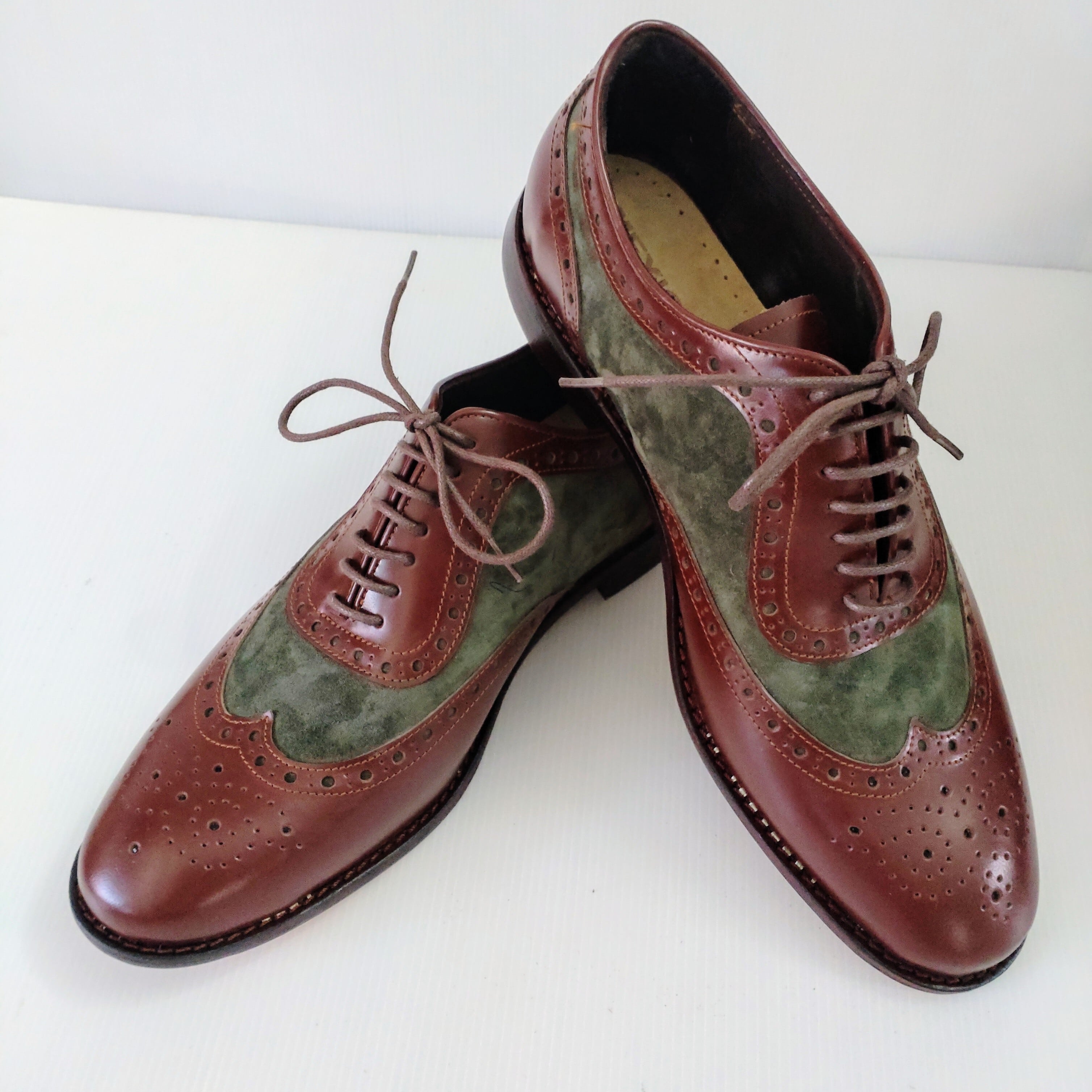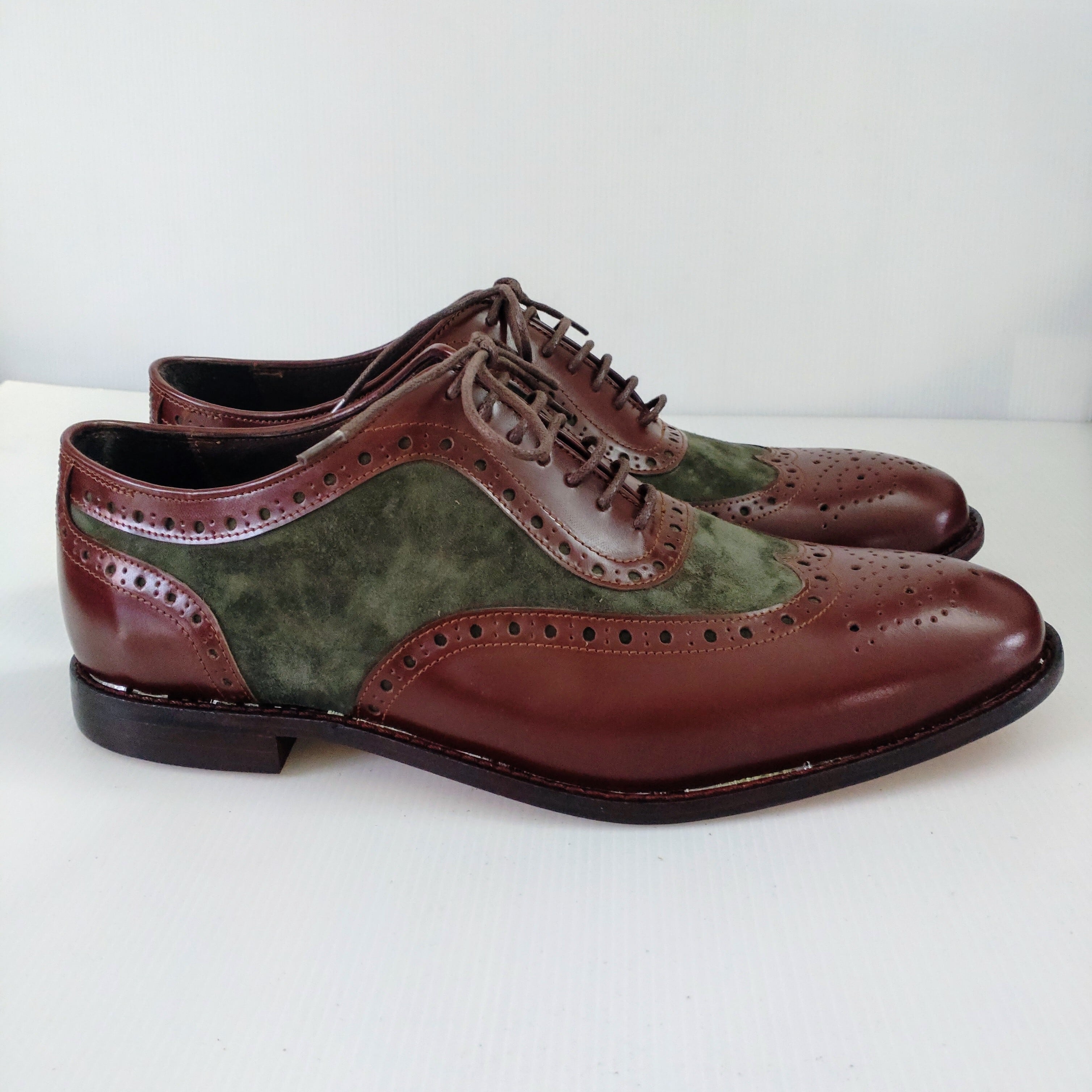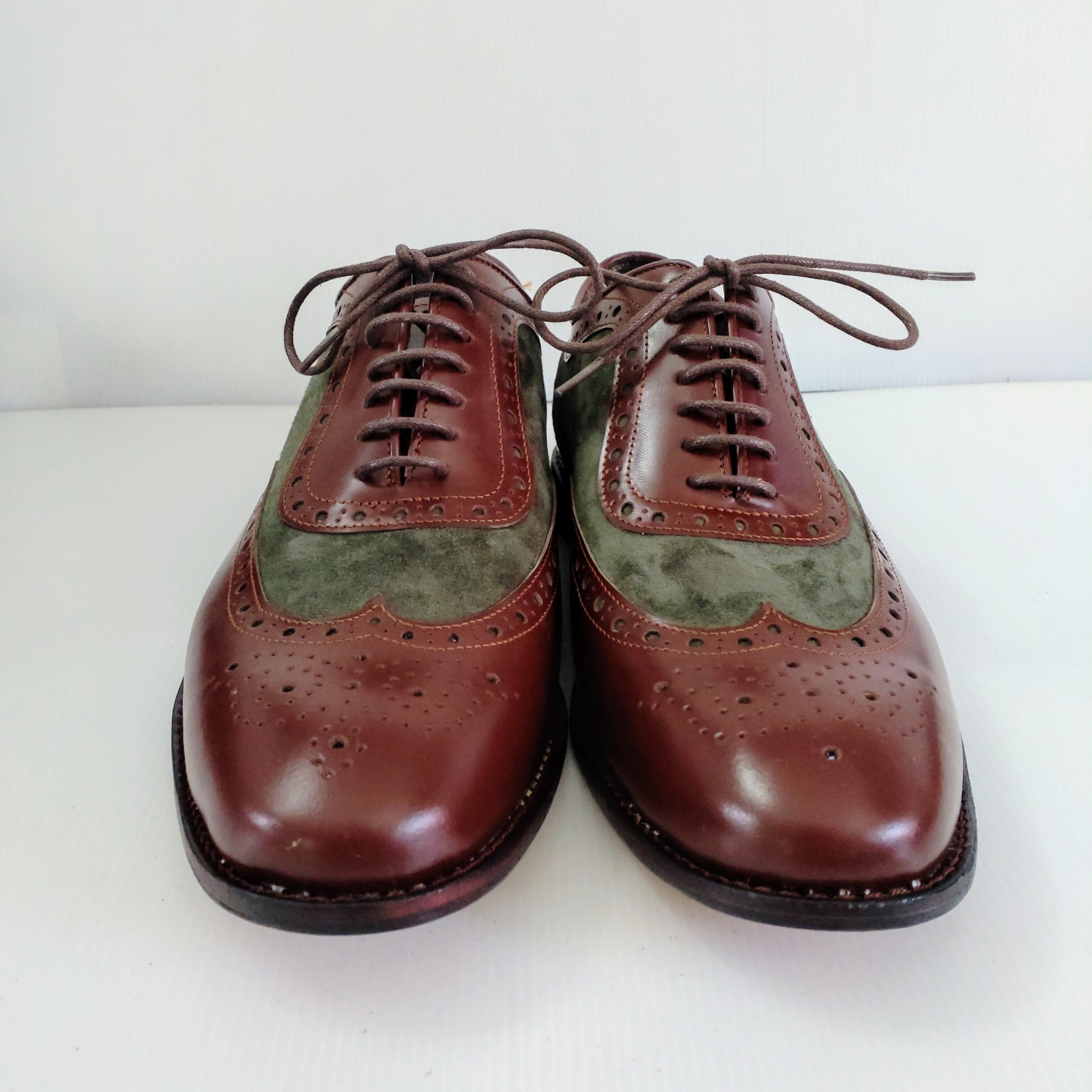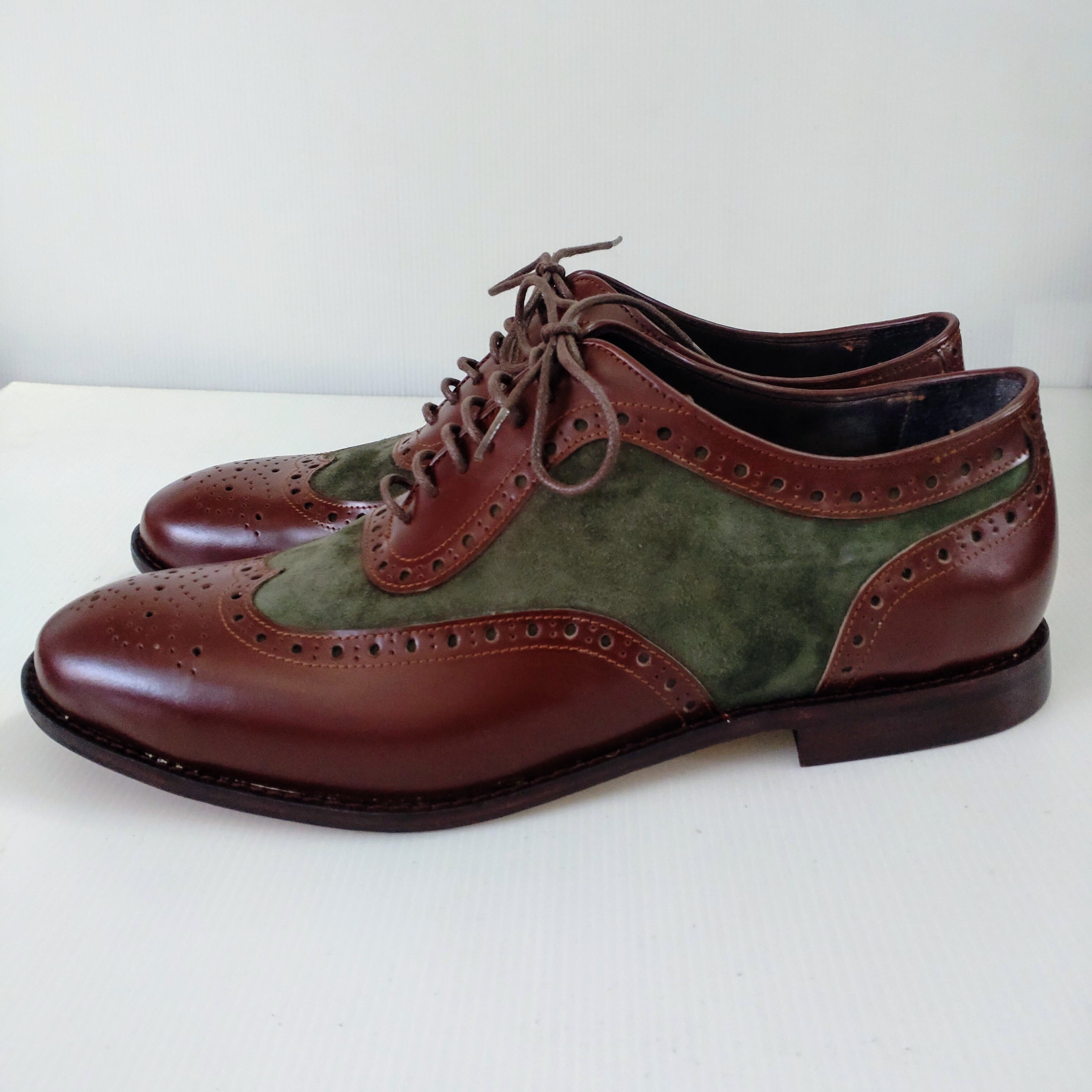 本革ブラウンレザーとスエードグリーンでメダリオン装飾したオシャレな本革ウイングチップシューズを製作致しました。
